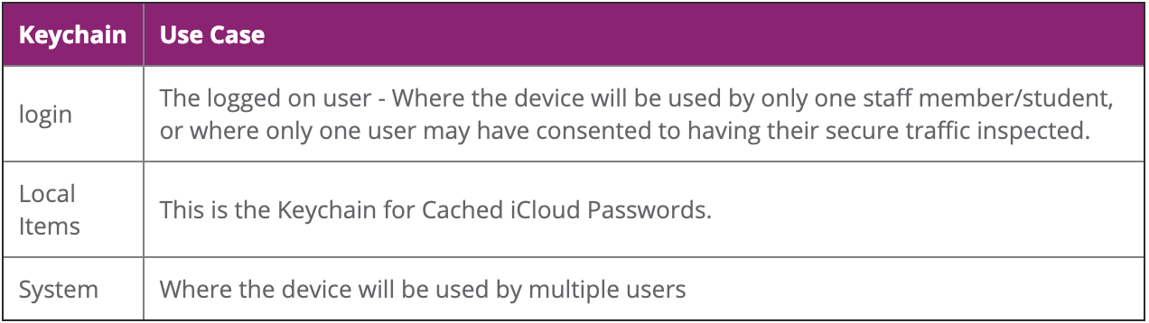 When installing certificates manually onto devices which run Apple OS X, some additional steps are required to maintain maximum security. This involves installing the certificate into the correct keychain. There are three options to choose from.